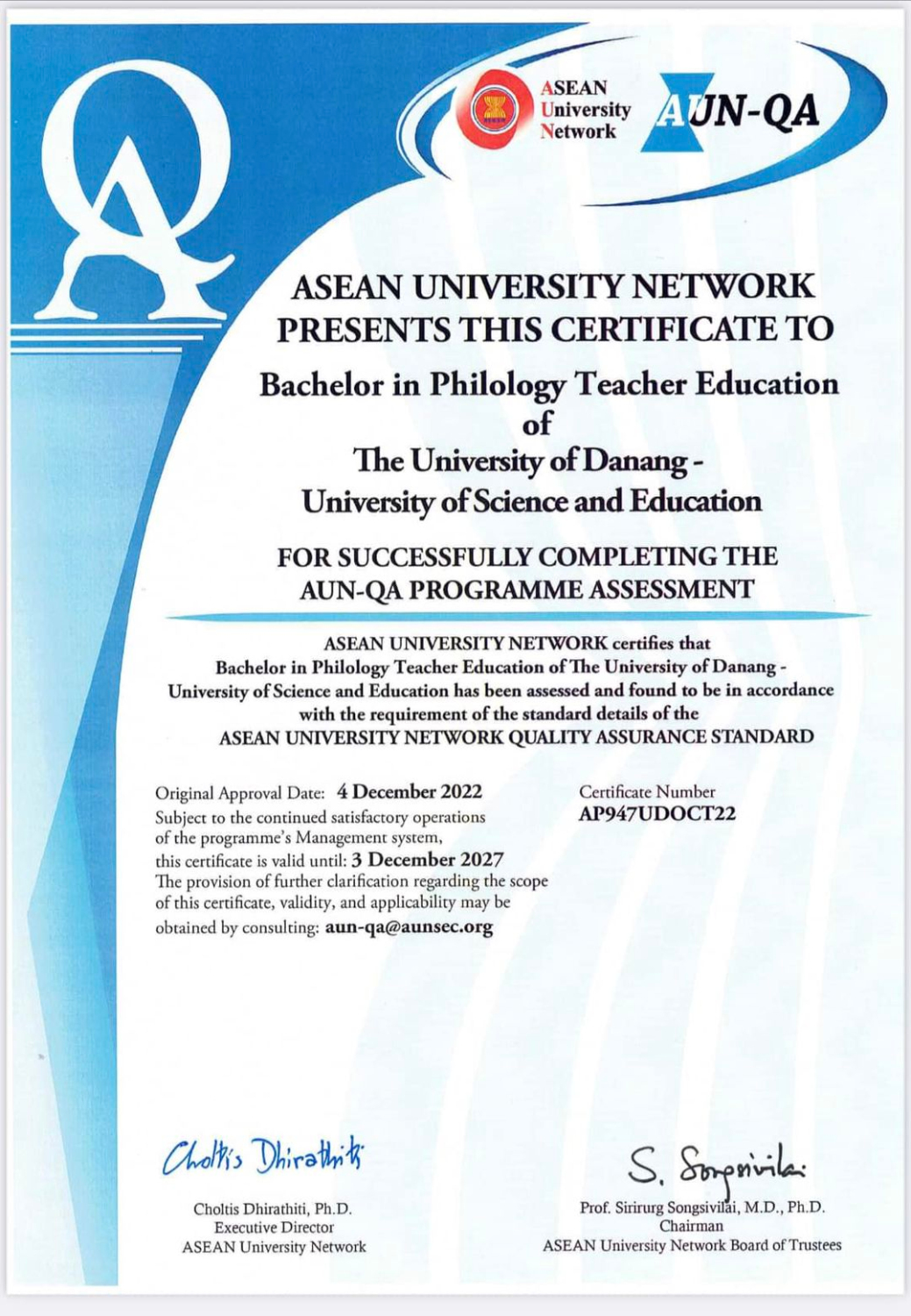 Sau hơn một năm chuẩn bị, sáu tháng tiến hành kiểm định, Ngành SƯ PHẠM NGỮ VĂN - Khoa Ngữ văn - Trường Đại học Sư phạm - ĐH Đà Nẵng chính thức được công nhận chuẩn chương trình đào tạo theo bộ tiêu chuẩn AUN-QA.